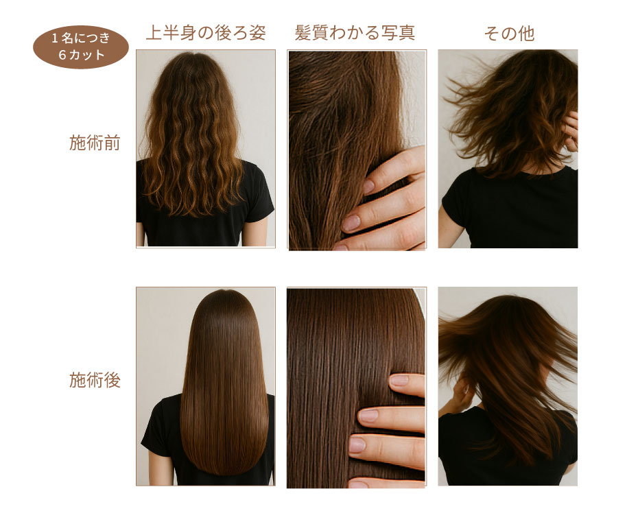 ※ヘアモデル2名×施術前と施術後×3カット(上半身の後ろ姿、髪質のわかる写真、その他)